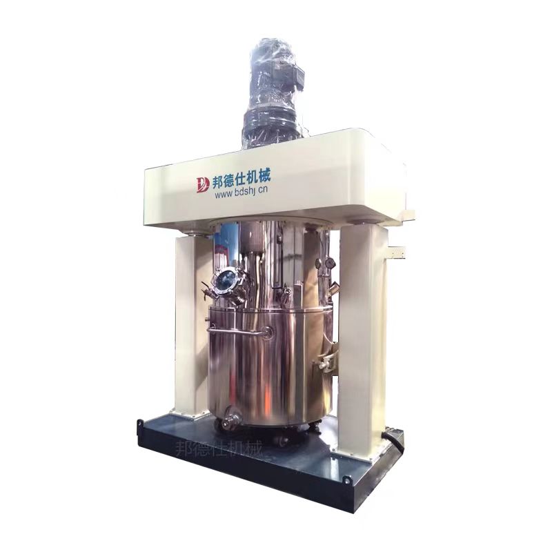行星攪拌機(jī)是一種新型高效無(wú)死點(diǎn)混合攪拌設(shè)備。它具有獨(dú)特、新穎的攪拌形式。釜內(nèi)有兩根或三根多層漿葉式攪拌器和一至兩個(gè)自動(dòng)刮刀,攪拌器在繞釜體軸線公轉(zhuǎn)的同時(shí),又以不同的轉(zhuǎn)速繞自身軸線自轉(zhuǎn),使物料在釜體內(nèi)作復(fù)雜的運(yùn)動(dòng),受到強(qiáng)烈的剪切和搓合。此外設(shè)備內(nèi)的刮壁刀繞釜體軸線轉(zhuǎn)動(dòng),將粘在壁上之物料刮下參于混合,使其效果更為理想。釜體采用特殊密封結(jié)構(gòu),可進(jìn)行加壓及抽真空,具有良好的排氣除泡效果。缸體夾套可根據(jù)用戶需要進(jìn)行加熱、冷卻。出料方式為壓料式,設(shè)備缸蓋可液壓升降,缸體可自由移動(dòng),操作十分方便。而且攪拌槳及刮刀可隨橫梁上升而完全脫離缸體,便于清潔。